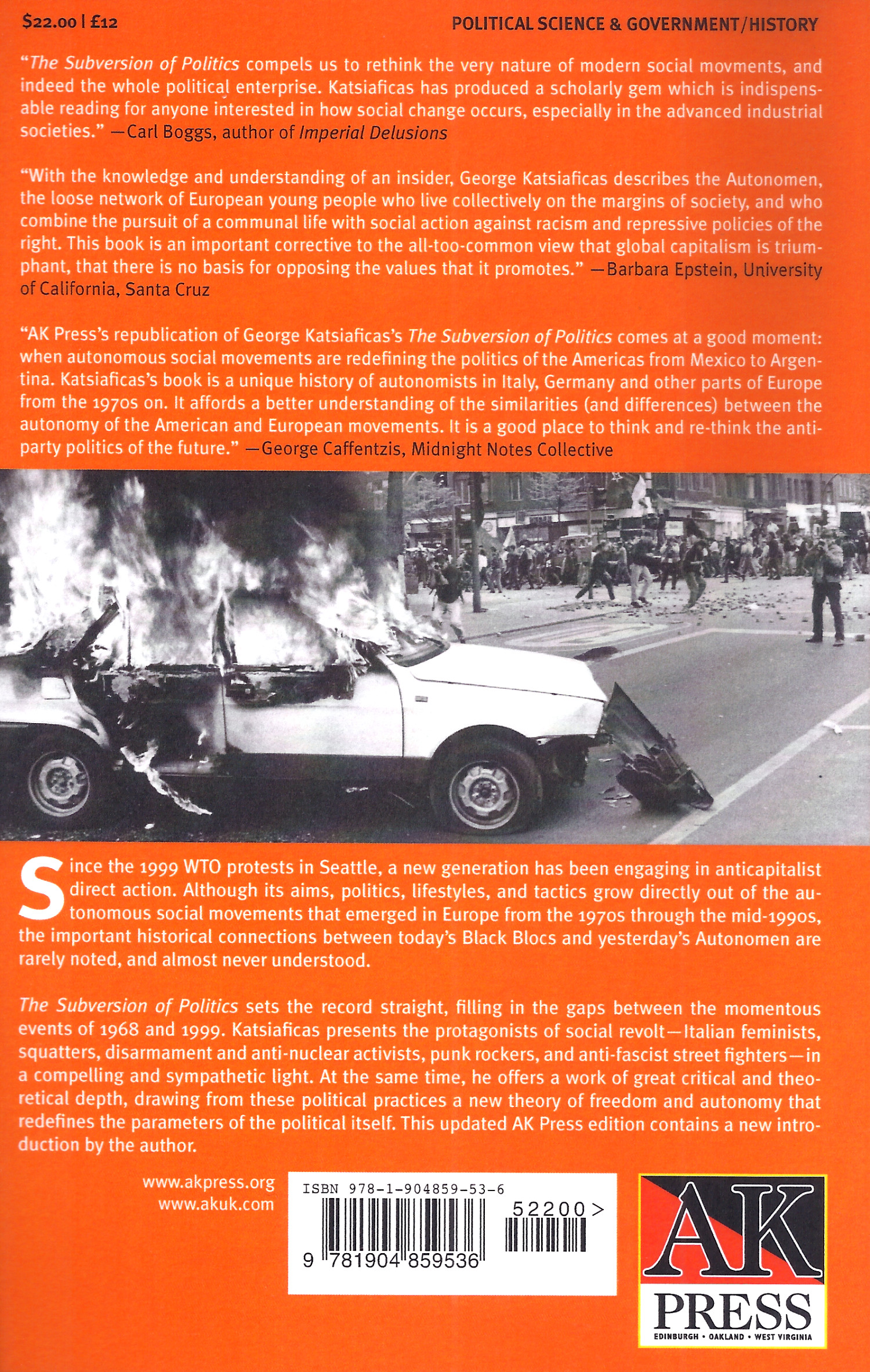 Subversion of Politics sets the record straight, filling the gaps between the momentous events of 1968 and 1999. Katsiaficas presents the protagonists of social revolt - Italian feminists, squatters, disarmament and anti-nuclear activists, punk rockers, and anti-fascist street fighters - in a compelling and sympathetic light. At the same time, he offers a work of great critical depth, drawing from these political practices a new theory of freedom and autonomy that redefines the parameters of the political itself. George Katsiaficas. AK Press, 2006. This is an updated AK Press edition which contains a new introduction by the author.