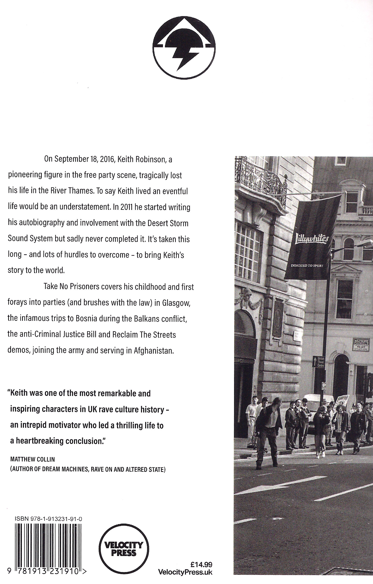 Take No Prisoners: The Desert Storm Sound System Story covers his childhood and first forays into parties (and brushes with the law) in Glasgow, the infamous trips to Bosnia during the Balkans conflict, the anti-Criminal Justice Bill and Reclaim The Streets demos in Trafalgar Square, joining the army and serving in Afghanistan. The book also contains many photos from Keith’s life, a foreword by Matthew Collin (author of Dream Machines, Rave On and Altered State) and an epilogue written by Ray Philp (Red Bull Music Academy).