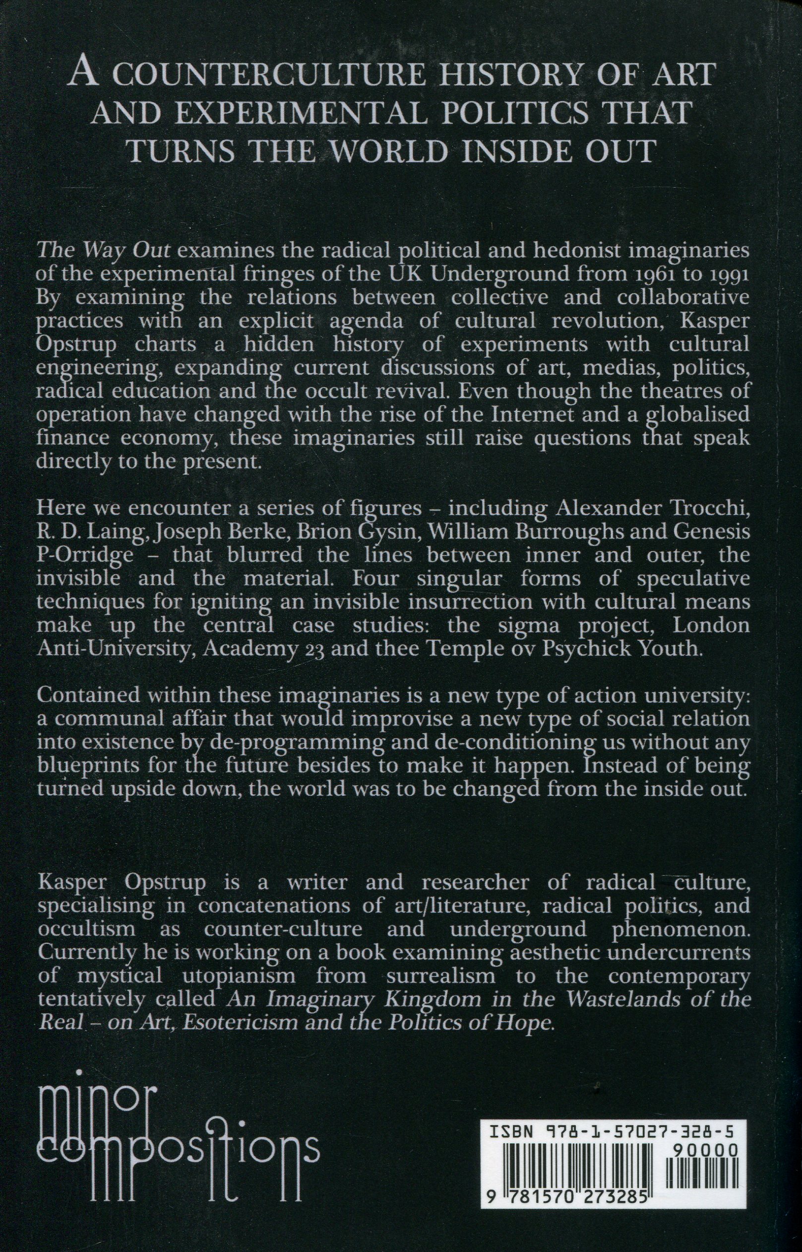 The Way Out examines the radical political and hedonist imaginaries of the experimental fringes of the UK Underground from 1961 to 1991 By examining the relations between collective and collaborative practices with an explicit agenda of cultural revolution, Kasper Opstrup charts a hidden history of experiments with cultural engineering, expanding current discussions of art, medias, politics, radical education and the occult revival. Even though the theatres of operation have changed with the rise of the Internet and a globalised finance economy, these imaginaries still raise questions that speak directly to the present.