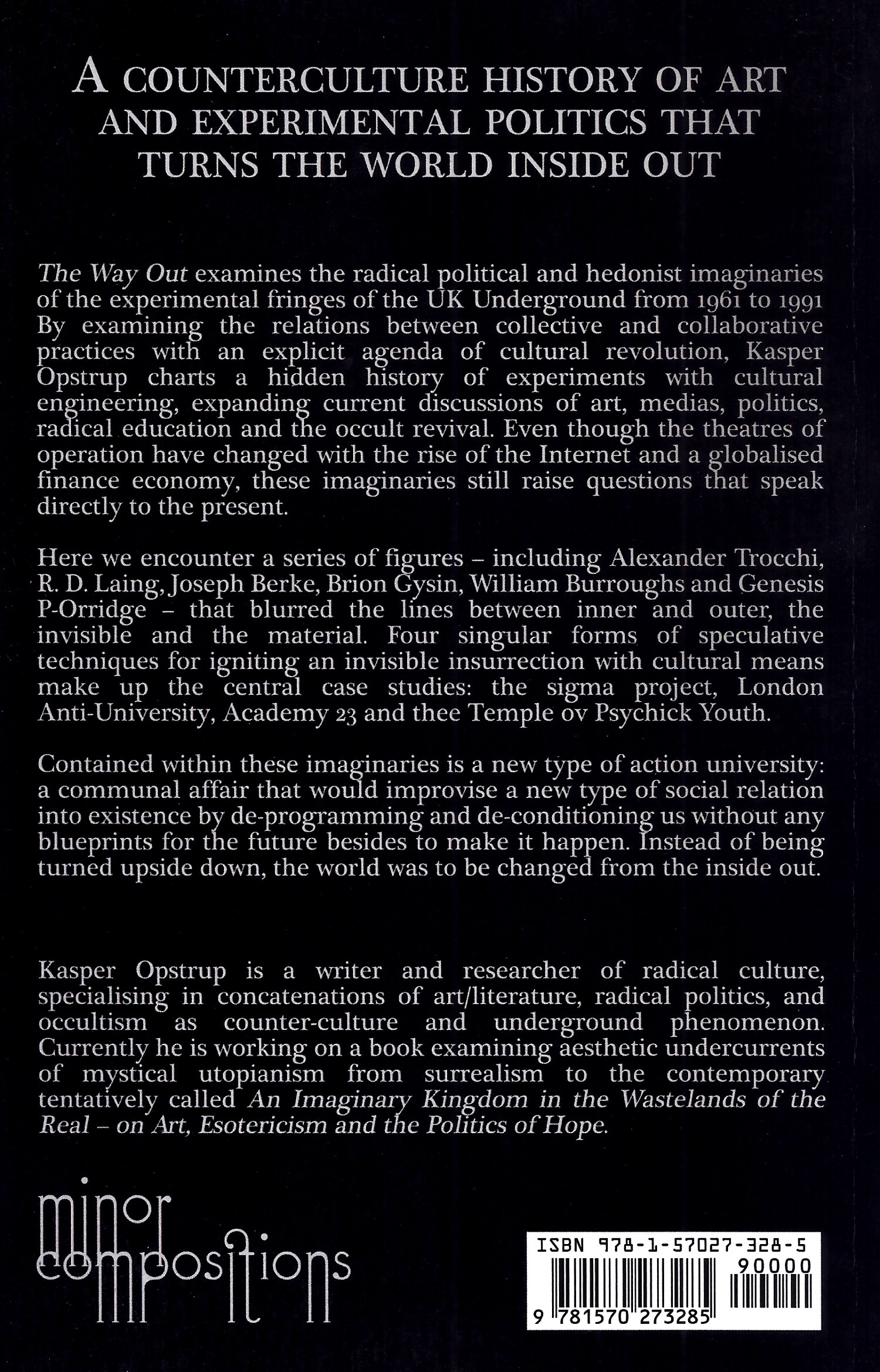 Here we encounter a series of figures – including Alexander Trocchi, R. D. Laing, Joseph Berke, Brion Gysin, William Burroughs and Genesis P-Orridge – that blurred the lines between inner and outer, the invisible and the material. Four singular forms of speculative techniques for igniting an invisible insurrection with cultural means make up the central case studies: the sigma project, London Anti-University, Academy 23 and thee Temple ov Psychick Youth.
